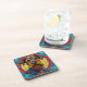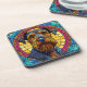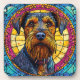 Retrato de un perro con una barba espesa y tupida y ojos expresivos, enmarcado por un vibrante fondo similar a vidrieras en tonos amarillos, rosados y azules.