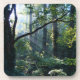 Brillantes rayos blancos del sol matutino fluyen desde detrás de ramas oscuras hacia un rico bosque de verano verde, con enormes árboles cubiertos de hiedra y un fértil maleza.