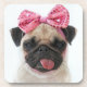 Sacar el perro con la lengua con una cinta rosada secuintada, de fondo blanco.