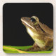 Fotografía de una rana común en una hoja sobre fondo negro.