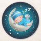Onderzetter met een vrolijke en kleurrijke illustratie in cartoon stijl van een baby jongen die slaapt op de maan. Een uil zit op zijn been en op de achtergrond is een sterrenhemel zichtbaar.