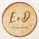 Para un tema de boda rústica. El fondo representa una rebanada de madera marrón. Todo el texto está en letras manuscritas marrones. Hay 2 iniciales grandes de la novia y el novio, unidas con un signo +. Debajo de ellas, está la fecha, en dígitos más pequeños.