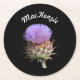 El cardo morado en flor se destaca en el fondo negro. Personalice con un nombre de familia en texto curvado en la parte superior.