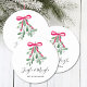 Estos Navidades fiestas de papel castrador están decorados con mistletoe verde acuarela, una cinta roja, y elegante tipografía de escritura que dice "Jingle y mingle" Fácilmente personalizable. Acuarela original © Michele Davies.