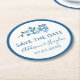 Floral salva la montaña de papel de dátiles en azul y blanco con un olvido de no ramillete. El diseño está enmarcado por un borde azul oscuro redondo. Añade tus nombres en un guión fino y encantador sobre tu fecha boda en letras modernas.