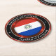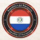 The national flag of the Republic of Paraguay (Official Name), is infused into a circle shape. There is a black inner ring, on which the official country name is written in Spanish and in English. The design is coloured in a red/orange mixture to give it an almost bronze-like look.