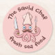 Personalizado del chef del calamar rosa con bigote sosteniendo cuchillo y tenedor de cocina. Color de fondo personalizado. Dos campos de texto personalizado en círculo.