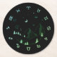 Astrology themed round paper coaster features Zodiac wheel illustration with center etching style mountain landscape on black background