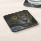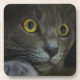Un primer plano de la cara de un gato gris con ojos amarillos y pupilas dilatadas, apoyándose en su pata y mirando con atención algo detrás de la cámara.