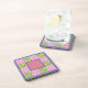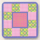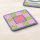 Un conjunto de galletitas cuadradas, con respaldo de corcho o de copas de bebida, con un patrón de imitación de patchwork de primroses rosa, azul violeta y amarillo sobre un frondoso fondo verde, con puntos de gingham y polka de color rosa y blanco profundo; de la colección "Primroses" de Posh & Painterly.