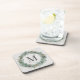Elegant hard plastic holiday beverage coaster design features a rustic chic white wood grain background with a wreath of winter watercolor greenery framing a family / last name monogram initial.