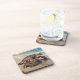 Coastal themed coaster with an illustration of a mama sea turtle and baby crawling into the blue ocean waves on a sandy beach.