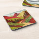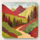 Un paisaje abstracto con texturas únicas que muestra un paisaje montañoso con senderos de senderismo y árboles y hermosos rayos de sol en tonos rojos, crimson, amarillos y verdes.