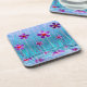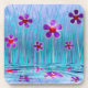 Dibujo digital de flores moradas lindas y estilizadas con brillantes centros rojos. Te miran curiosamente desde la hierba alta junto a una piscina de agua transparente.