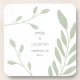 Estilo moderno para las mesas del día de bodas o para los aficionados a los gustos de los huéspedes con elegantes hojas verdes de salvia y tipografía simplista con sus nombres y fecha boda que usted puede personalizar fácilmente, sobre un fondo blanco.