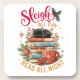 A festive and cheerful Christmas design showcases an adorable black kitten nestled on a stack of books. Beside the books are vibrant poinsettias, pine branches, holly berries, and a steaming cup of cocoa. Golden stars frame the scene, adding a magical touch. The colorful text reads, "'Sleigh all day, read all night." This delightful design is featured on a variety of products, making perfect gifts for book lovers.