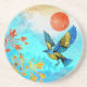Este magnífico diseño representa un pájaro azul y dorado que aterriza en un árbol dorado con un hermoso cielo de muchos colores azules y un atrevido sol naranja.