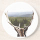 Una pintura digital de la cabeza de un Buck con vistas a colinas cubiertas de árboles y montañas entre sus cuervos. Esta imagen no tiene fondo, puede elegir un color de fondo diferente.