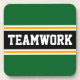 Este divertido y deportivo diseño presenta texto atlético TEAMWORK dentro de una banda central horizontal negra realzada con doble franjas de carreras de naranja blanco y amarillo contra bordes exteriores verdes del bosque. Los colores y el texto de este diseño se pueden personalizar.