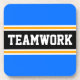 Este divertido y deportivo diseño presenta un texto atlético TEAMWORK dentro de una banda central horizontal negra realzada con doble franjas de carreras de naranja blanco y amarillo contra bordes exteriores azules brillantes. Los colores y el texto de este diseño se pueden personalizar.