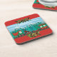 Feliz tren navideño con fondo rojo y el pequeño perro escocés a lo largo del tren.