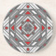 Una mandala cuadrada concéntrica toma la apariencia de un túnel que atrae al espectador con una combinación de líneas anguladas, triángulos y círculos en tonos grises, rojos y blancos para casi crear una ilusión óptica.