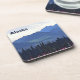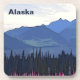 Montañas azules, agua de lago azul, árboles verde oscuro, epilobio rosa y cielo nublado. Una representación del verano en el extremo norte. También aparece el texto "Alaska". Mosquitos no incluidos.