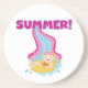 ¡Un diseño lindo para el verano, las características un chica cabelludo rubio en bañador y el anillo que viene abajo el tobogán acuático y el texto de las rosas fuertes y del azul que lee VERANO! Camisetas del verano, monos, baberos, tazas, tarjetas, bolsos, pegatinas, recuerdos, almohadas, y mucho más.