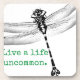 ¡Inspirate para vivir tu mejor vida! Gráfica de libélula negra y blanca con el texto "Vive una vida poco común"