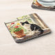 An illustration of a black and white cat sitting on a flower filled window sill illustration coaster for those that love their tuxedo cats.