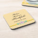 A beautiful set of coasters that brings back memories of your wedding day. Personalize it with names and wedding date. A small floral design hovers over a beveled gold band near the bottom of the design. When you select “Personalize this design” you will be offered options to easily change the text (wording, plus type font, color, size, position) and to possibly edit the design elements with changes you may want to make. You may want to also scroll down to the section "Transfer design to a product" for a few suggestions about other items this design can be used on.