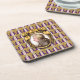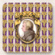 La obra de arte y el diseño originales de ZoeSPEAK on this Coaster presentan un retrato del compositor de música clásica Wolfgang Amadeus Mozart. El retrato es un perfil enmarcado en un marco dorado oval ornamentado. El marco cuelga sobre un fondo de papel pintado de color púrpura con racimos dorados de uvas en filas y rayas verticales blancas y lavanda.