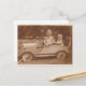 Imagen vintage del niño y chica en la tarjeta postal del coche de juguete
