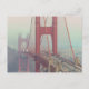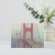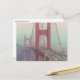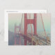 La imagen muestra una vista parcial del puente Golden Gate en San Francisco, cubierto de niebla. El distintivo color rojo-naranja del puente es visible, contrastando con la niebla gris. Se ven coches conduciendo por el puente. El fondo presenta colinas borrosas y cielo debido a la niebla. El ambiente general es evocador y un poco misterioso.