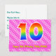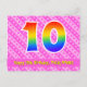 El frente de este diseño de tarjeta postal con tema de cumpleaños alegre y feliz presenta un gran número "10" con un patrón inspirado en el gradiente del espectro del arcoíris. También presenta el mensaje "Feliz cumpleaños 10" y un nombre de destinatario personalizable. La parte delantera también tiene un patrón a rayas rosa oscuro y rosa claro alegre con formas de corazón. La parte trasera incluye un mensaje de saludo de cumpleaños personalizado, o quizás podría estar en blanco si se desea escribir un mensaje a mano en su lugar. Una tarjeta postal de cumpleaños personalizada como esta podría ser una forma divertida de celebrar el décimo cumpleaños de alguien. Tarjetas postales como esta también podrían usarse para invitar a los invitados a una celebración de cumpleaños que se celebra para alguien que cumple 10 años. [~Z0000449]