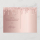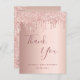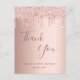 Una tarjeta de agradecimiento por 100 cumpleaños. Un color de fondo rosa de color falso dorado metálico. Con goteos falsos de purpurina, pinta goteo. En el frente, gran guión de color rosa oscuro con letras de color oro y el texto: Gracias, tu texto, título y una fecha. Parte posterior: plantilla para su nota de agradecimiento y nombre.