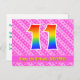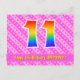 El frente de este diseño de tarjeta de cumpleaños animado, alegre y cariñoso presenta un gran número "11" con un patrón inspirado en gradiente de espectro de arcoíris, junto con el mensaje "Feliz cumpleaños número 11", y un nombre de destinatario editable. La parte delantera presenta además un patrón alegre de formas de corazón y rayas de color rosa claro y rosa oscuro. La parte trasera presenta un mensaje de saludo de cumpleaños editable, o quizás podría borrarse y dejarse en blanco si se desea escribir un mensaje a mano. Una tarjeta de cumpleaños personalizable como esta podría ser una forma divertida de enviar un mensaje para celebrar el cumpleaños de alguien. Las tarjetas postales como esta también podrían utilizarse para invitar a los invitados a una celebración de cumpleaños que se organice para alguien que cumple 11 años.
