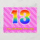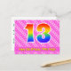 El frente de este diseño de tarjeta postal temática de cumpleaños alegre, feliz y afectuosa presenta un gran número "13" con un patrón de gradiente de espectro de arcoíris. También presenta el mensaje "Feliz cumpleaños 13", y un nombre de destinatario editable. La parte delantera también tiene un patrón alegre a rayas rosa oscuro y rosa claro que contiene formas de corazón. La parte trasera presenta un mensaje de saludo de cumpleaños personalizado, o quizás podría estar despejado y dejado en blanco si se va a escribir un mensaje a mano en su lugar. Una tarjeta postal de cumpleaños personalizada como esta podría ser una forma divertida de celebrar el decimotercer cumpleaños de alguien. Las tarjetas postales como esta también podrían utilizarse para invitar a los invitados a una fiesta de cumpleaños que se celebra para alguien que cumple 13 años.