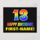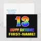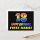 La parte delantera de este colorido, divertido y alegre diseño de postal de cumpleaños tiene un gran número "13" y el mensaje "FELIZ CUMPLEAÑOS", ambos coloreados con un patrón inspirado en el gradiente del espectro del arcoiris, junto con un audaz nombre de destinatario editable amarillo. En la parte delantera también hay un fondo sencillo, sencillo y de color negro. La parte posterior de la tarjeta postal tiene un mensaje de saludo de cumpleaños modificable, o tal vez podría ser borrado y dejado en blanco si se va a escribir un mensaje a mano. Una postal de cumpleaños personalizada y alegre como esta podría ser una manera divertida de enviar un mensaje celebrando el décimo tercer cumpleaños de alguien. [~Z0000474]