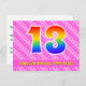 El frente de este diseño de tarjeta postal temática de cumpleaños alegre, feliz y afectuosa presenta un gran número "13" con un patrón de gradiente de espectro de arcoíris. También presenta el mensaje "Feliz cumpleaños 13" y un nombre de destinatario editable. La parte delantera también tiene un patrón alegre a rayas rosa oscuro y rosa claro que contiene formas de corazón. La parte trasera incluye un mensaje de saludo de cumpleaños personalizado, o quizás podría ser borrado y dejado en blanco si se desea escribir un mensaje a mano en su lugar. Una tarjeta postal de cumpleaños personalizada como esta podría ser una forma divertida de celebrar el decimotercer cumpleaños de alguien. Tarjetas postales como esta también podrían ser utilizadas para invitar a invitados a una fiesta de cumpleaños que se celebra para alguien que está cumpliendo 13 años. [~Z0000449]
