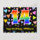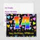 El frente de este diseño de tarjeta postal de cumpleaños divertida, colorida y llena de amor presenta un gran número "14" con un patrón inspirado en el gradiente del espectro del arcoíris, junto con el mensaje "Feliz cumpleaños 14", y un nombre de destinatario personalizable. La parte delantera presenta además un patrón de fondo vibrante y colorido con corazones amorosos de diferentes tamaños. La parte trasera presenta un mensaje de saludo de cumpleaños personalizado, o quizás podría estar en blanco si se desea escribir un mensaje a mano en su lugar. Una tarjeta postal de cumpleaños personalizada como esta podría ser una forma divertida de enviar un mensaje en celebración del cumpleaños número catorce de alguien. Las tarjetas postales como esta también podrían usarse para invitar a los invitados a una fiesta de cumpleaños que se celebra para alguien que cumple 14 años. [~Z0000448]