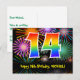 El frente de este divertido, colorido y emocionante diseño de tarjeta postal de cumpleaños presenta un gran número "14" con un patrón inspirado en el gradiente del espectro del arcoíris, junto con el mensaje "Feliz cumpleaños 14", y un nombre de destinatario personalizado. La parte delantera tiene además un patrón de fondo vibrante y colorido inspirado en fuegos artificiales celebratorios que estallan. La parte posterior presenta un mensaje de saludo de cumpleaños editable, o quizás podría borrarse y dejarse en blanco si se desea escribir un mensaje a mano. Una tarjeta postal de cumpleaños personalizable como esta podría ser una forma divertida de reconocer el cumpleaños de alguien. Las tarjetas postales como esta también podrían usarse para invitar a los invitados a una fiesta de cumpleaños o celebración que se organice para alguien que cumpla 14 años.
