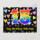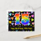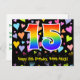 El frente de este diseño de tarjeta postal temática de cumpleaños, colorido, divertido y emocionante, presenta un gran número "15" con un patrón inspirado en gradiente de espectro de arcoíris, junto con el mensaje "Feliz cumpleaños 15", y un nombre de destinatario personalizable. La parte delantera presenta además un colorido y vibrante patrón de fondo de corazones amorosos. La parte trasera presenta un mensaje de saludo de cumpleaños personalizado, o quizás podría estar en blanco si se desea escribir un mensaje a mano. Una tarjeta postal de cumpleaños personalizable como esta podría ser una forma divertida de enviar un mensaje para celebrar el decimoquinto cumpleaños de alguien. Tarjetas postales como esta también podrían usarse para invitar a invitados a una fiesta de cumpleaños o celebración que se organice para alguien que cumpla 15 años.