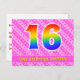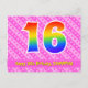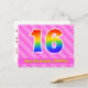 El frente de este diseño de tarjeta postal temática de cumpleaños divertida y alegre presenta un gran número "16" con un patrón inspirado en el gradiente del espectro del arcoíris, junto con el mensaje "Feliz 16 cumpleaños", y un nombre de destinatario editable. La parte delantera presenta además un patrón feliz a rayas rosa oscuro y rosa claro con formas de corazón. La parte trasera cuenta con un mensaje de felicitación de cumpleaños editable, o quizás podría estar despejada y dejada en blanco si se desea escribir un mensaje a mano en su lugar. Una tarjeta postal de cumpleaños personalizada como esta podría ser una forma divertida de enviar un mensaje para celebrar el decimosexto cumpleaños de alguien. Tarjetas postales como esta también podrían utilizarse para invitar a los invitados a una celebración de cumpleaños que se celebra para alguien que cumple 16 años. [~Z0000449]