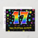 El frente de este divertido, emocionante y colorido diseño de tarjeta postal temática de cumpleaños presenta un gran número "17" con un patrón inspirado en el gradiente del espectro del arcoíris, junto con el mensaje "Feliz cumpleaños 17" y un nombre de destinatario personalizado. La parte delantera presenta además un vibrante y colorido patrón de fondo con formas de estrellas de diferentes tamaños. La parte trasera presenta un mensaje de saludo de cumpleaños personalizado, o quizás podría estar en blanco si se desea escribir un mensaje a mano. Una tarjeta postal de cumpleaños personalizable como esta podría ser una forma divertida de reconocer el cumpleaños número 17 de alguien. Las tarjetas postales como esta también podrían usarse para invitar a los invitados a una celebración de cumpleaños que se celebra para alguien que cumple 17 años. [~Z0000447]