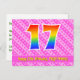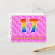 El frente de este diseño de tarjeta postal divertido, alegre y con tema de cumpleaños presenta un gran número "17" con un patrón inspirado en el gradiente del espectro del arcoíris. También presenta el mensaje "Feliz cumpleaños 17" y un nombre de destinatario personalizado. La parte delantera también cuenta con un patrón alegre de corazones y rayas en rosa oscuro y rosa claro. La parte trasera presenta un mensaje de saludo de cumpleaños personalizado, o quizás podría estar en blanco si se desea escribir un mensaje a mano. Una tarjeta postal de cumpleaños personalizada como esta podría ser una forma divertida de enviar un mensaje para celebrar el cumpleaños número diecisiete de alguien. Tarjetas postales como esta también podrían usarse para invitar a invitados a una fiesta de cumpleaños o celebración que se organice para alguien que cumple 17 años. [~Z0000449]
