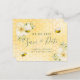 Una tarjeta Save the Date para una fiesta de cumpleaños del 18 de verano. Fondo amarillo y blanco con un patrón de peine de miel. Decorado con flores tropicales de color amarillo claro, color crema, hibiscos y abejas con burbujas alegres. Plantillas para una fecha y nombre/edad 18. Letras verdes de color gris. El texto: Save the Date se escribe con un gran guión de estilo escrito a mano. Sugerencia: Si no desea que se vea como una postal, haga clic en personalizar, vaya a la parte posterior y quite el separador y el sello postal.