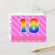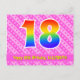 El frente de este diseño de tarjeta postal de cumpleaños cariñoso, animado y alegre presenta un gran número "18" con un patrón inspirado en gradiente de espectro de arcoíris. También presenta el mensaje "Feliz cumpleaños 18," y un nombre de destinatario personalizado. El frente presenta adicionalmente un patrón alegre de formas de corazón y rayas de color rosa claro y rosa oscuro. La parte trasera presenta un mensaje de felicitación de cumpleaños editable, o quizás podría borrarse y dejarse en blanco si se desea escribir un mensaje a mano en su lugar. Una tarjeta postal de cumpleaños personalizable como esta podría ser una forma divertida de enviar un mensaje para celebrar el cumpleaños número dieciocho de alguien. Las tarjetas postales como esta también podrían utilizarse para invitar a los invitados a una celebración de cumpleaños o fiesta que se celebra para alguien que cumple 18 años. [~Z0000449]