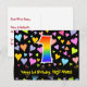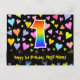 El frente de este diseño de tarjeta postal temática de cumpleaños colorido, emocionante y divertido presenta un gran número "1" con un patrón inspirado en el gradiente del espectro del arcoíris. También presenta el mensaje "Feliz cumpleaños número 1", y un nombre de destinatario personalizado. La parte delantera también tiene un patrón vibrante y colorido de formas de corazones amorosos. La parte posterior presenta un mensaje de saludo de cumpleaños personalizado, o quizás podría estar en blanco si se desea escribir un mensaje a mano. Una tarjeta postal de cumpleaños personalizada como esta podría ser una forma divertida de enviar un mensaje para celebrar el primer cumpleaños de alguien. Las tarjetas postales como esta también podrían usarse para invitar a los invitados a una celebración de cumpleaños o fiesta que se celebra para alguien que cumple 1 año. [~Z0000448]