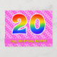 El frente de este diseño de tarjeta postal temática de cumpleaños feliz, alegre y cariñosa presenta un gran número "20" con un patrón de gradiente de espectro de arcoíris, junto con el mensaje "Feliz cumpleaños 20", y un nombre de destinatario personalizable. El frente presenta adicionalmente un patrón de rayas felices de color rosa claro y rosa oscuro que contienen formas de corazón. La parte posterior presenta un mensaje de saludo de cumpleaños personalizable, o quizás podría estar despejado y dejado en blanco si se va a escribir un mensaje a mano en su lugar. Una tarjeta postal de cumpleaños personalizable como esta podría ser una forma divertida de enviar un mensaje para celebrar el vigésimo cumpleaños de alguien. Las tarjetas postales como esta también podrían usarse para invitar a los invitados a una celebración de cumpleaños o fiesta que se organice para alguien que cumple 20 años.
